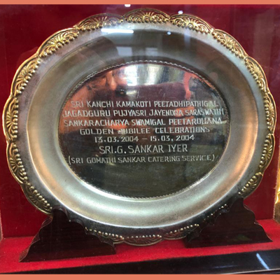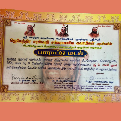 "Received Award from Ramco Group Chairman Mr Rama Subramaniya Raja in front of Ex-President Thiru R Venkatraman and Balaperiyava at Kanchipuram"